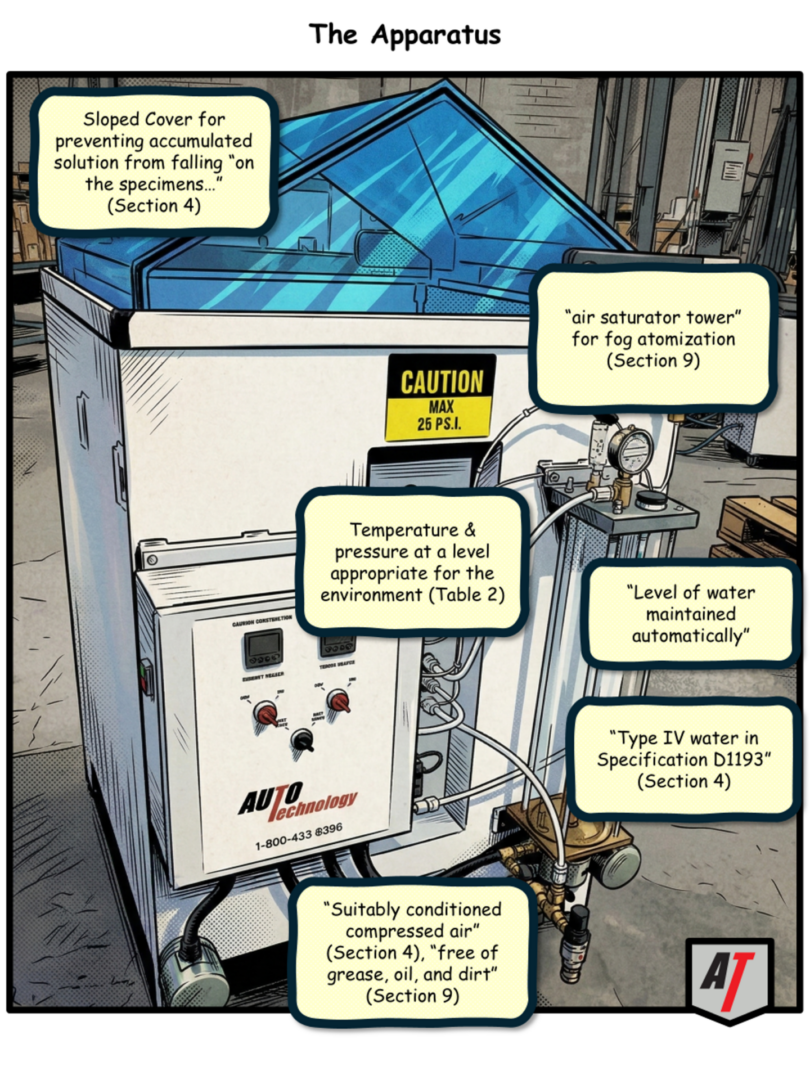 It is important to understand that ASTM B117 is not really a “test” at all. As the title states, it is a Standard Practice for Operating Salt Spray (Fog) Apparatus. Without the right chamber, built the right way, you cannot run B117.