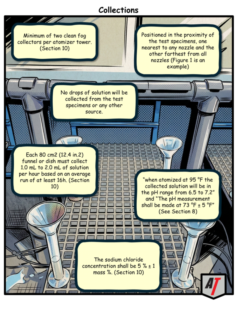 B117 verifies chamber performance using collection funnels placed near the specimens. These collectors confirm that the fog environment remains within the required parameters.