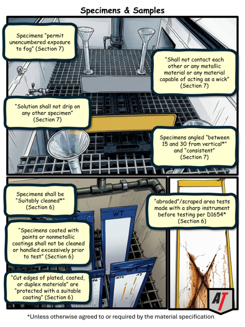 Specimen preparation and evaluation are not defined by B117 itself. Those details are established by the governing coating or product standards.