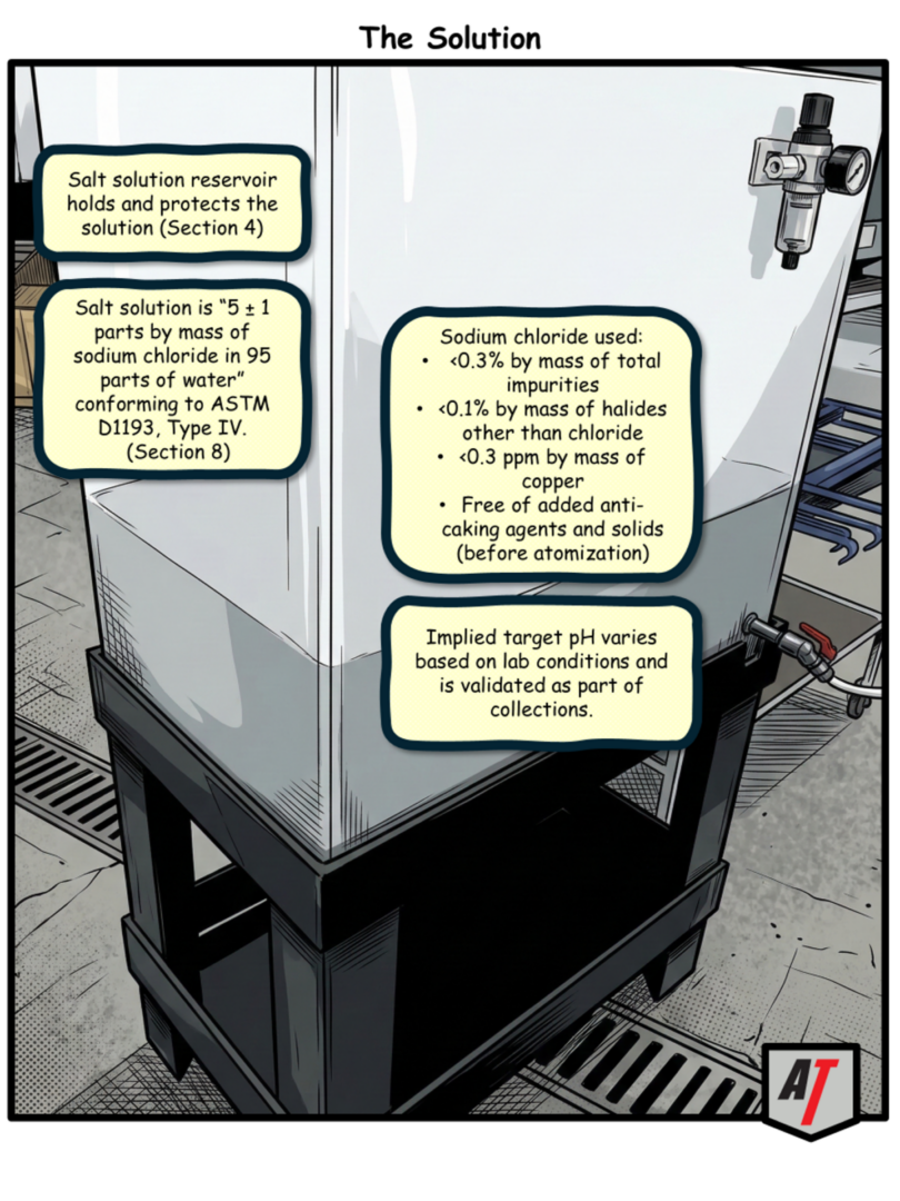 These three statements form the backbone of B117. The practice defines the environment. Other standards define the test duration and how corrosion damage is evaluated.